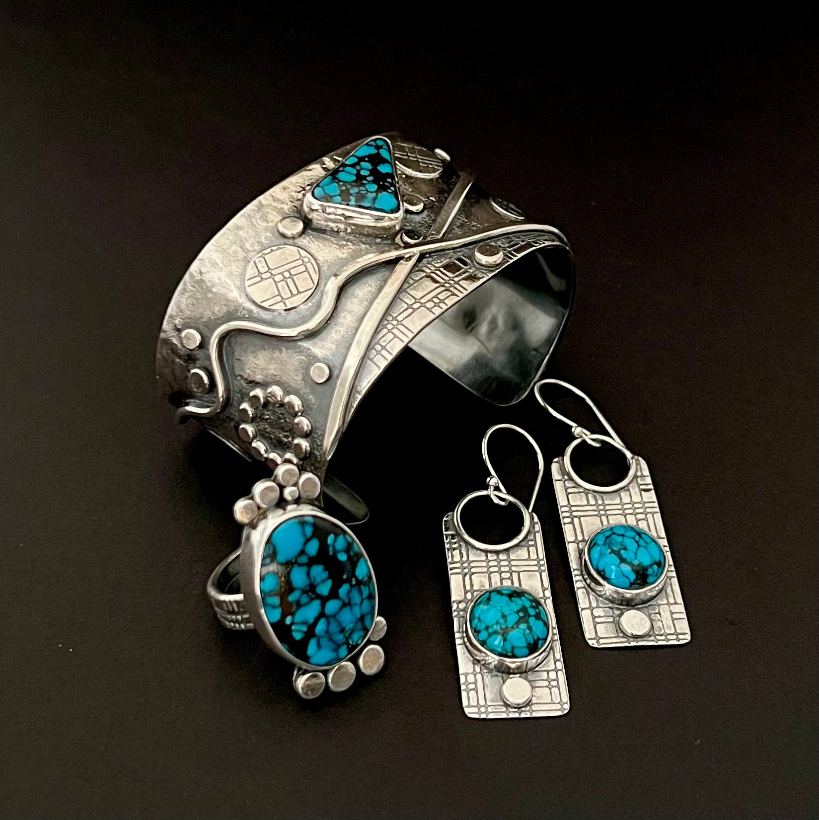 All Sterling Silver Cuff with a Cloud Mountain Turquoise Stone. Lots of texture and pattern adorn this 2 inch wide cuff. It fits a medium wrist, about 5 1/2 - 6 1/2 inches around. Just take a tape measure around your wrist and measure the size. Cheers♥️