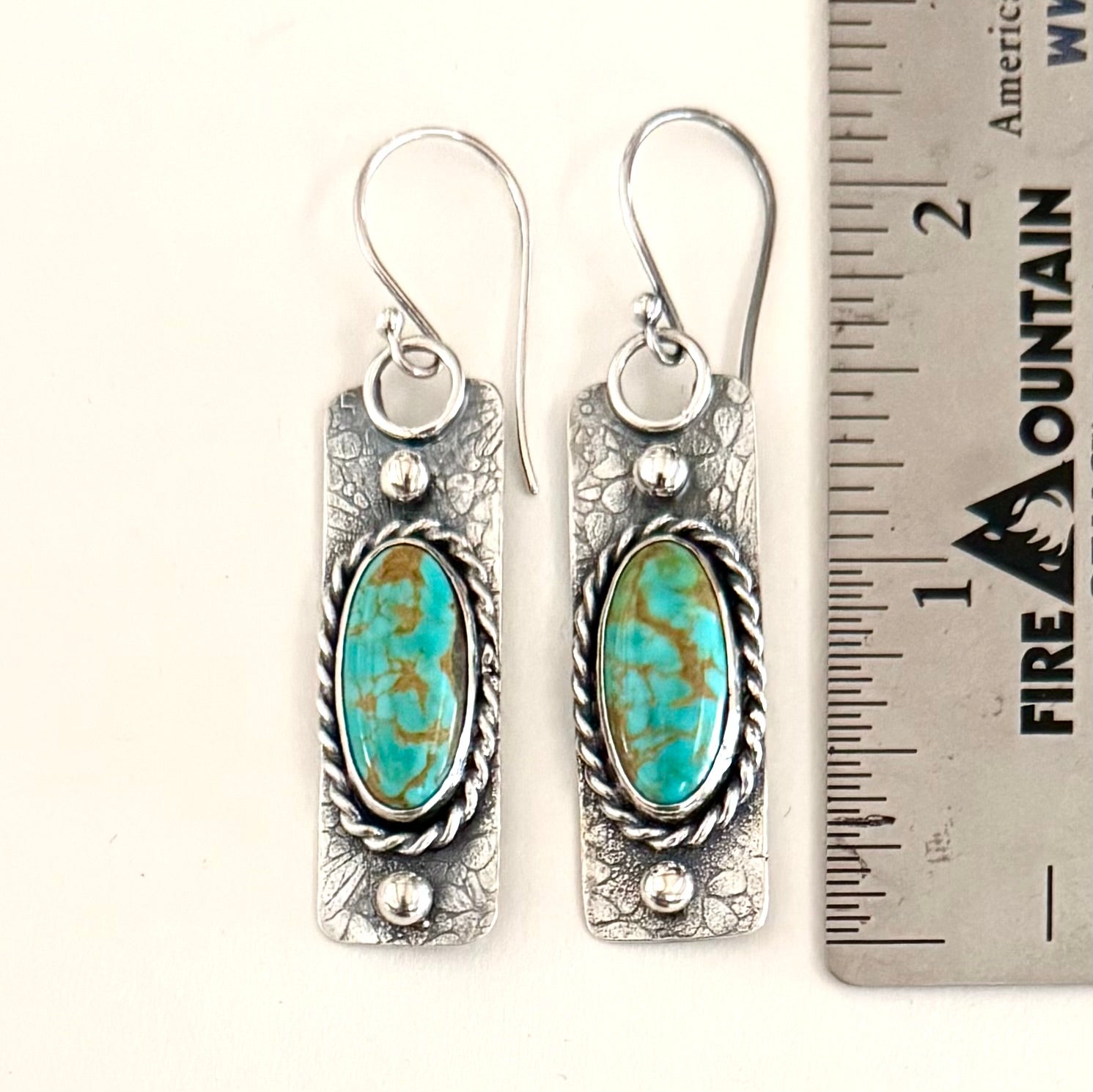 Turquoise is always good for a little lift in your day. Every piece is different, an original even before I start settling it! It makes you happy inside. This pair is all Sterling Silver and Kingman Turquoise from Arizona. A great addition to your earring collection. Thanks