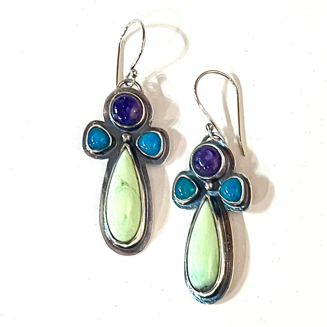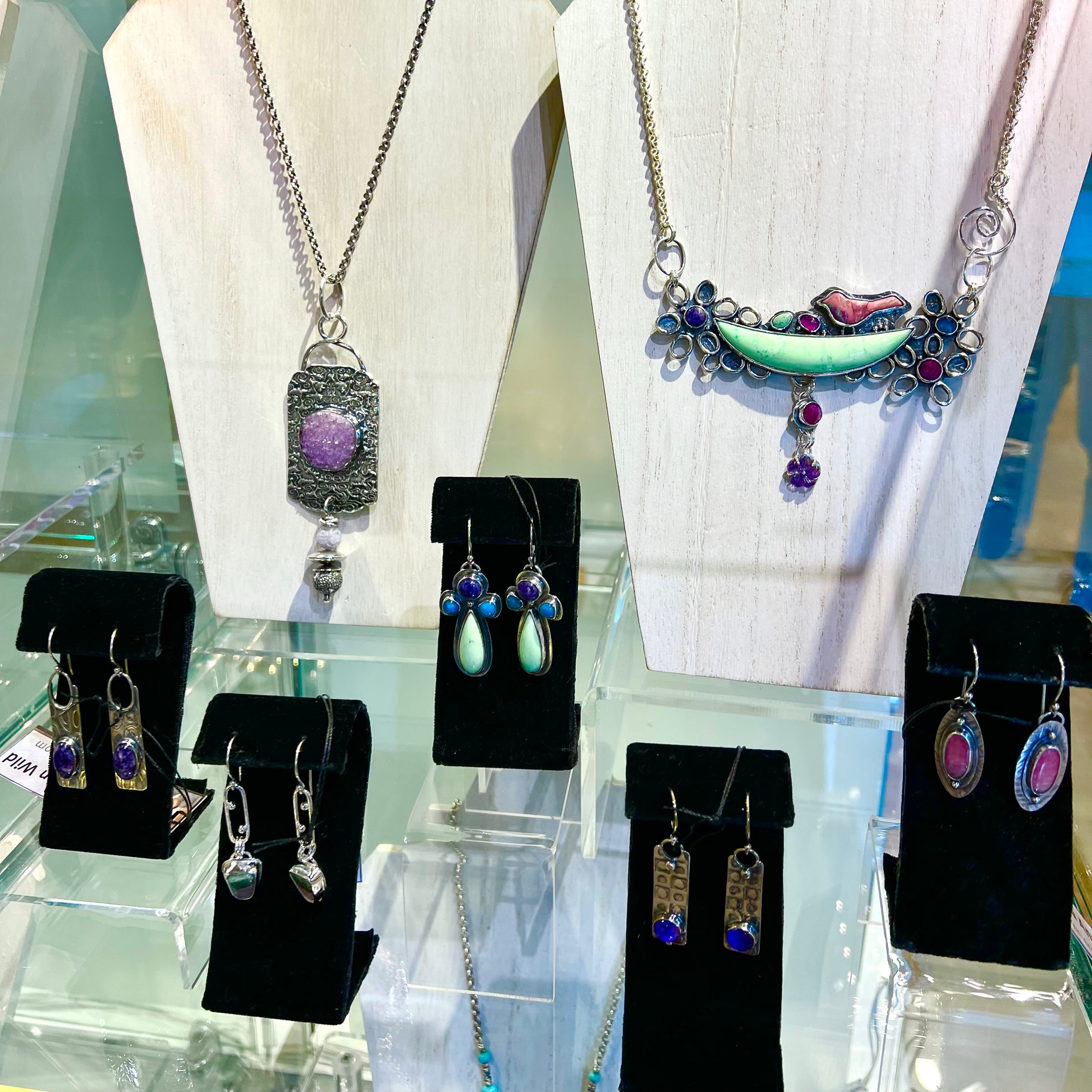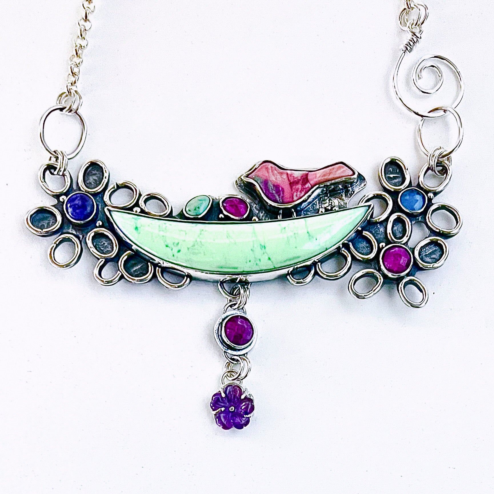 This Necklace is just so fun!🌸 Spring and Summer brings us flowers and so must I. All Sterling Silver with a collection of beautiful stones. Chrysoprase is the big green stone, with charoite, london blue topaz, mozambique garnet, varicite, amethyst flower & a ruby. The clasp closes in front for easy doing and undoing, all on a sturdy sterling chain that I can adjust to fit. The piece is about 5 1/2 inches wide. I’m always available for questions so never hesitate. designsbywild@hotmail.com or 253-225-1242