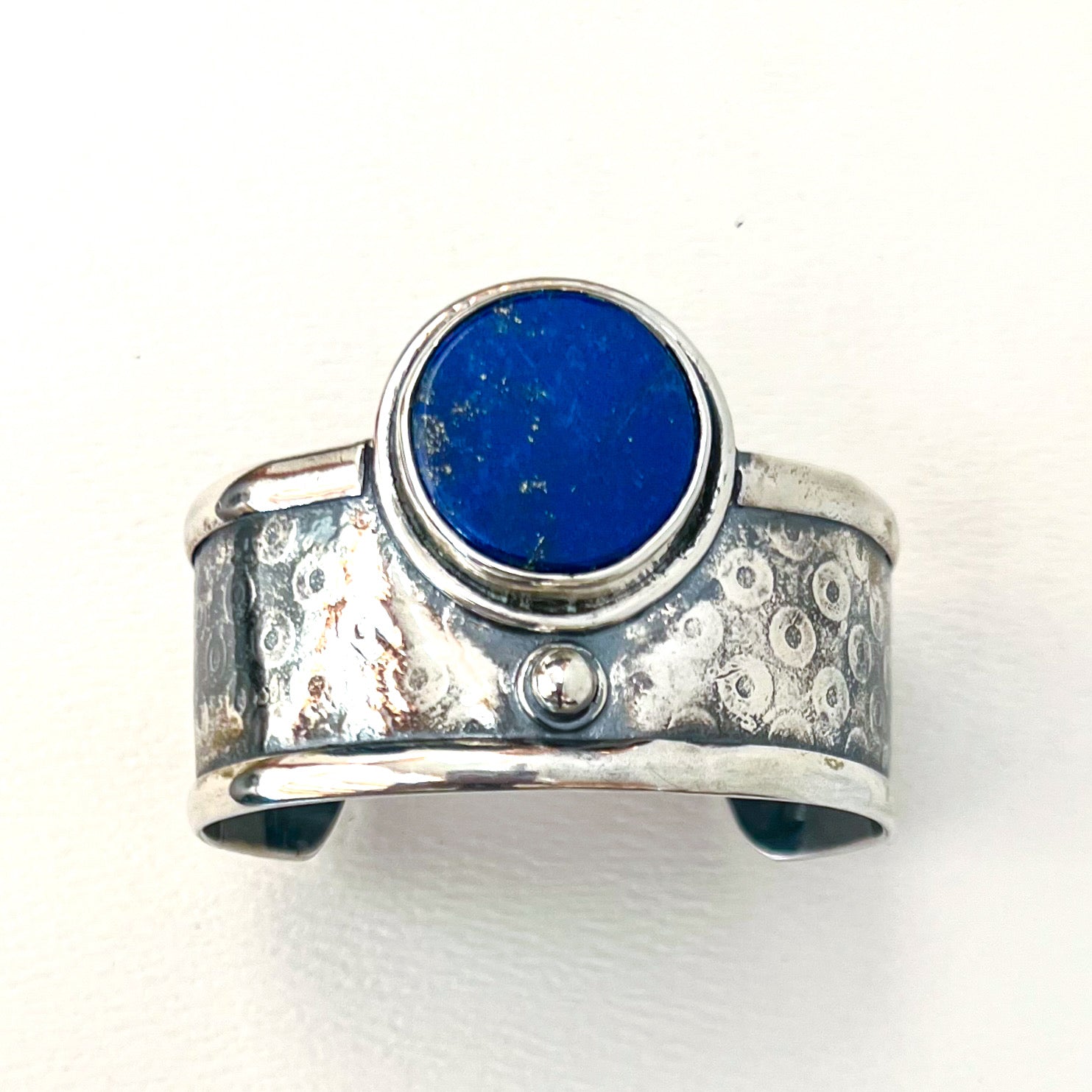 A beautiful clean looking cuff that’s very light in weight, but looks chunky. A nice round cut piece of Lapis sits comfortably on your wrist facing your fingers. Very easy to wear. Fits a size 6 to 7 inch wrist. It can be made smaller to fit. Thanks♥️