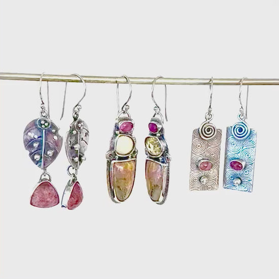 This is a beautiful pair of Regency Rose Plume Agate stones set with Pink Tourmaline and Citrine. The Agate’s color has layers of pink and browns and golds. The video shows a bit better. Little details make these earrings unique and quite special. About 2 inches long.